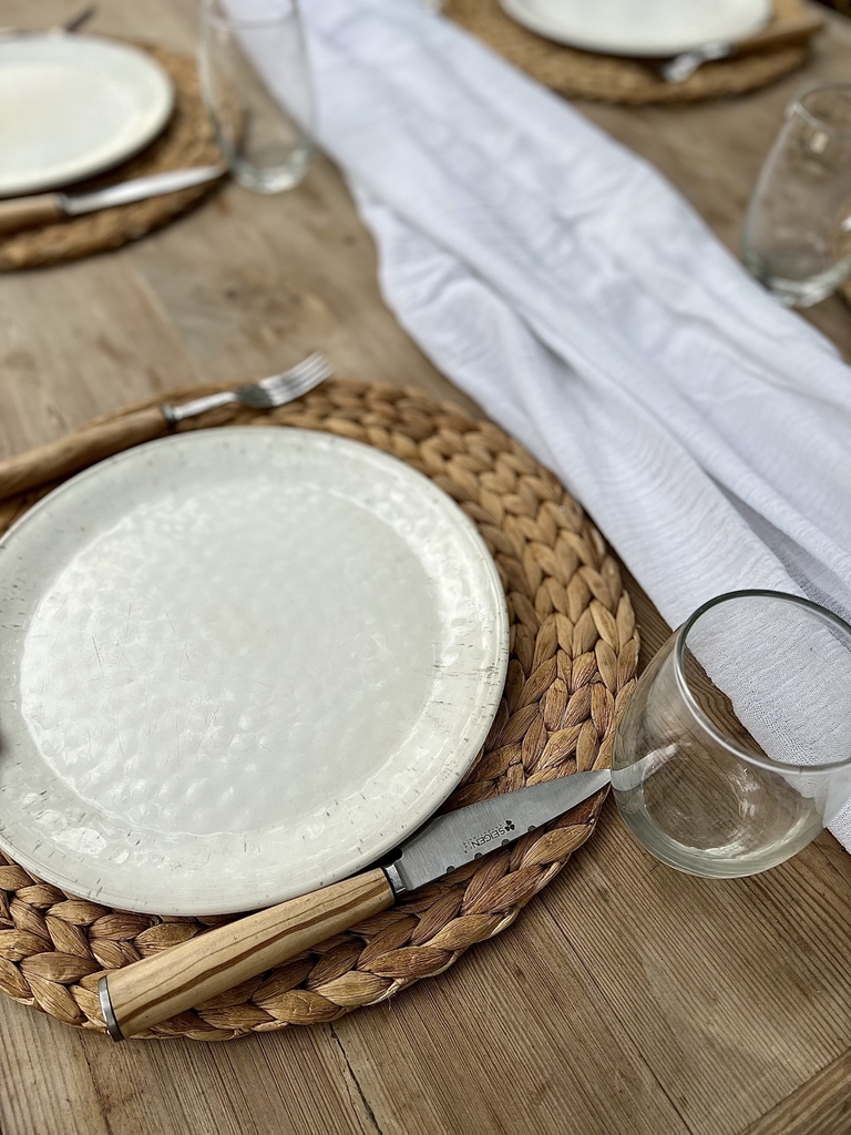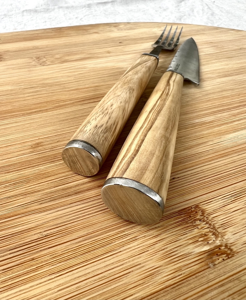 Caja juego individual de cubiertos de acero inoxidable y madera de olivo para asado.